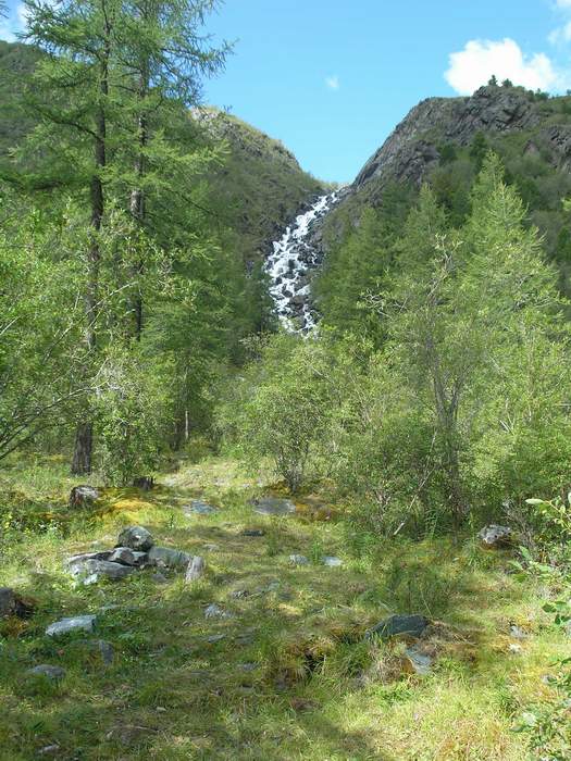 На пути к Аккемскому озеру - ясное небо и водопад