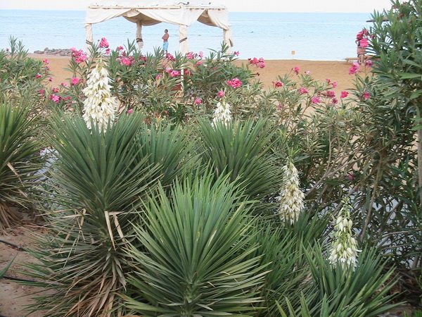 На пляже на фоне отдыхающих неплохо смотрятся юкки и олеандры.