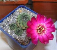 Описание: Сильно кустящаяся миниатюра. Одиночный стебель достигает высоты и диаметра в 4 см. Верхушка вдавленная. Стебель разделен на плоские ромбовидные бугорки. Цвет стебля - от темно-зеленого (на фото) до фиолетового. Ареолы удлиненные.